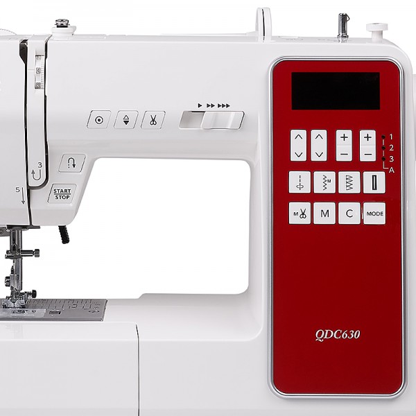 Компьютерная модель Janome QDC 630 представлена в пластиковом корпусе, выполненном в белом цвете с красной вставкой в области панели управления. Для продолжительной эксплуатации машинки разработчики использовали стальной каркас с нержавеющим напылением. Во время работы устройство рекомендуется устанавливать на ровной поверхности: за счет нескольких прорезиненных ножек швейная машинка надежно фиксируется на любой поверхности и не скользит во время работы.