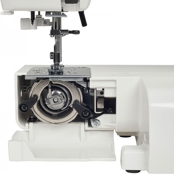 Применение мощного двигателя способствует работе с различными типами тканей. Встроенный нитевдеватель упрощает и ускоряет процесс подготовки к шитью одежды. Для использования разных по степени плотности материалов достаточно отрегулировать высоту подъема прижимной лапки. Использование съемного свободного рукава помогает совершать обработку узких или круговых изделий. Высокое качество сборки конструкции отвечает за стабильную и продуктивную эксплуатацию. Под пластиковым корпусом находится внутренний металлический каркас, что является основой агрегата. Такая надежная защита помогает уберечь все детали от попадания влаги внутрь корпуса.